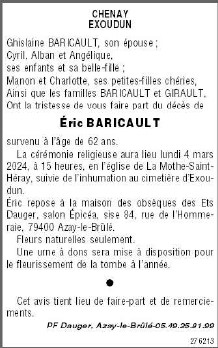 Cet espace « condoléances » est dédié à la mémoire de Monsieur Éric BARICAULT.