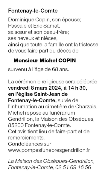 Cet espace « condoléances » est dédié à la mémoire de Monsieur Michel COPIN.