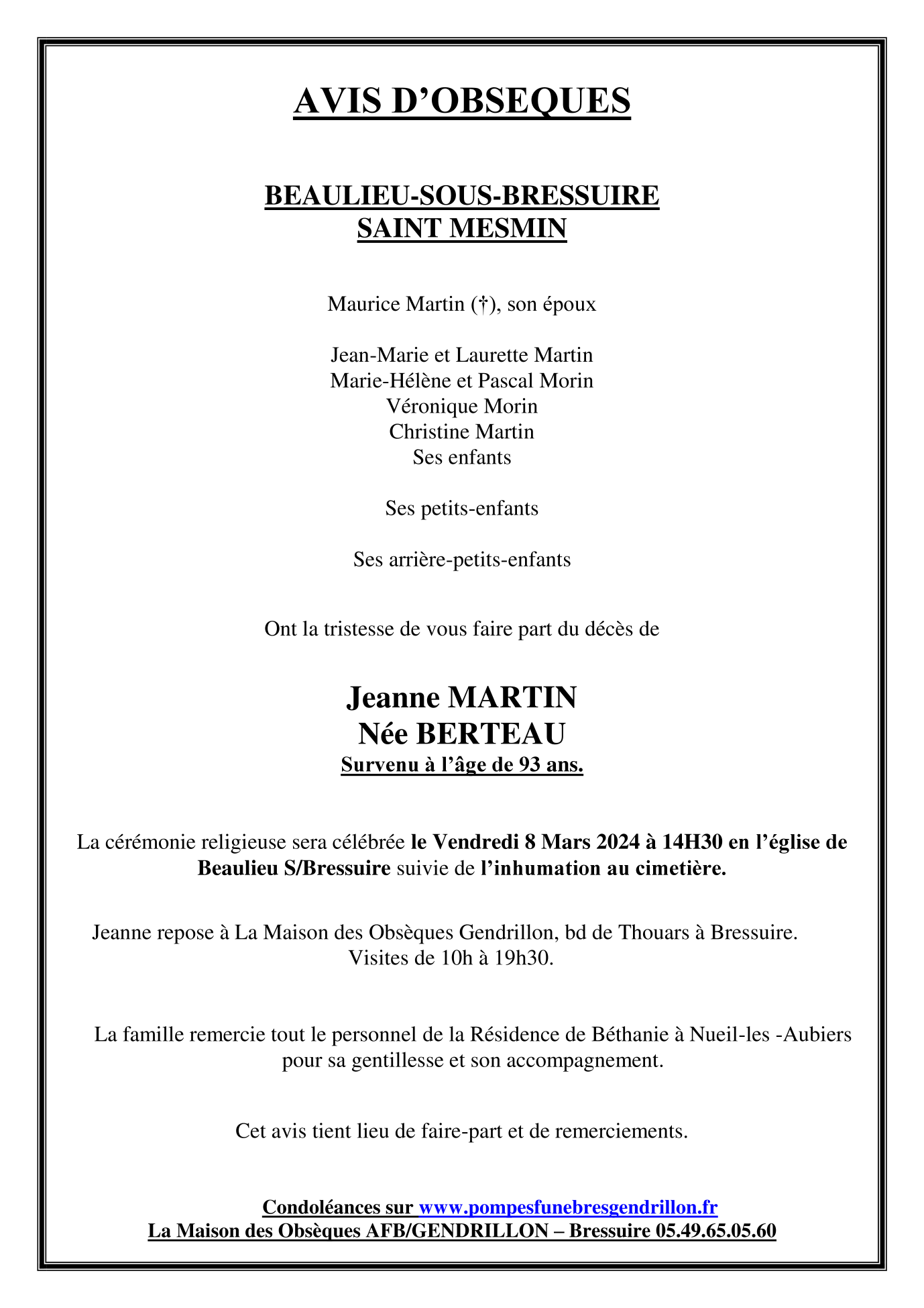 de Madame Jeanne MARTIN née BERTEAU
