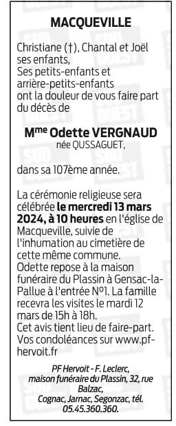 de Madame Odette VERGNAUD née QUSSAGUET