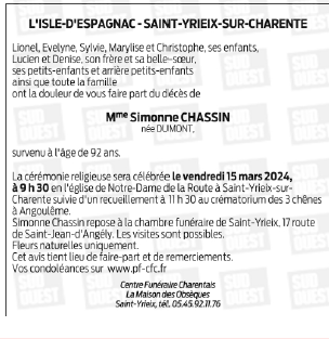 Décédée à Saint-Yrieix-sur-Charente (16710) le vendredi 8 mars 2024