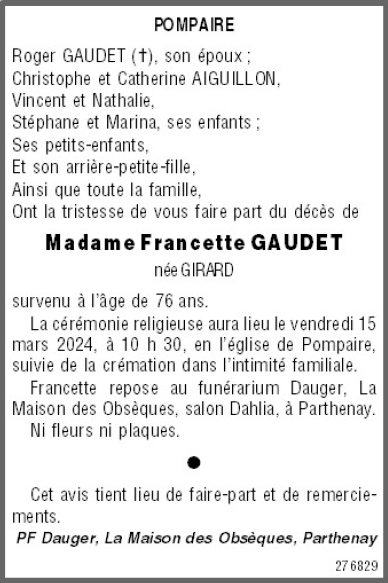 de Madame Francette GAUDET née GIRARD
