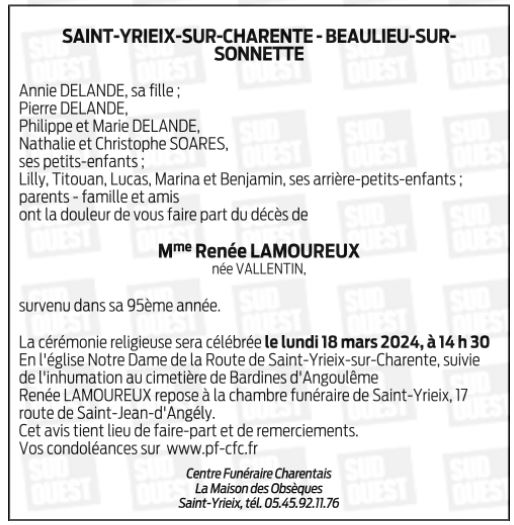Décédée à Confolens (16500) le lundi 11 mars 2024