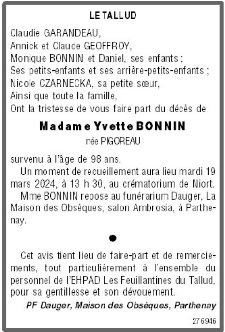 de Madame Yvette BONNIN née PIGOREAU