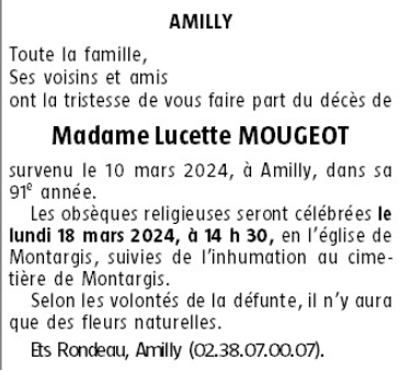 Cet espace « condoléances » est dédié à la mémoire de Madame Lucette MOUGEOT.