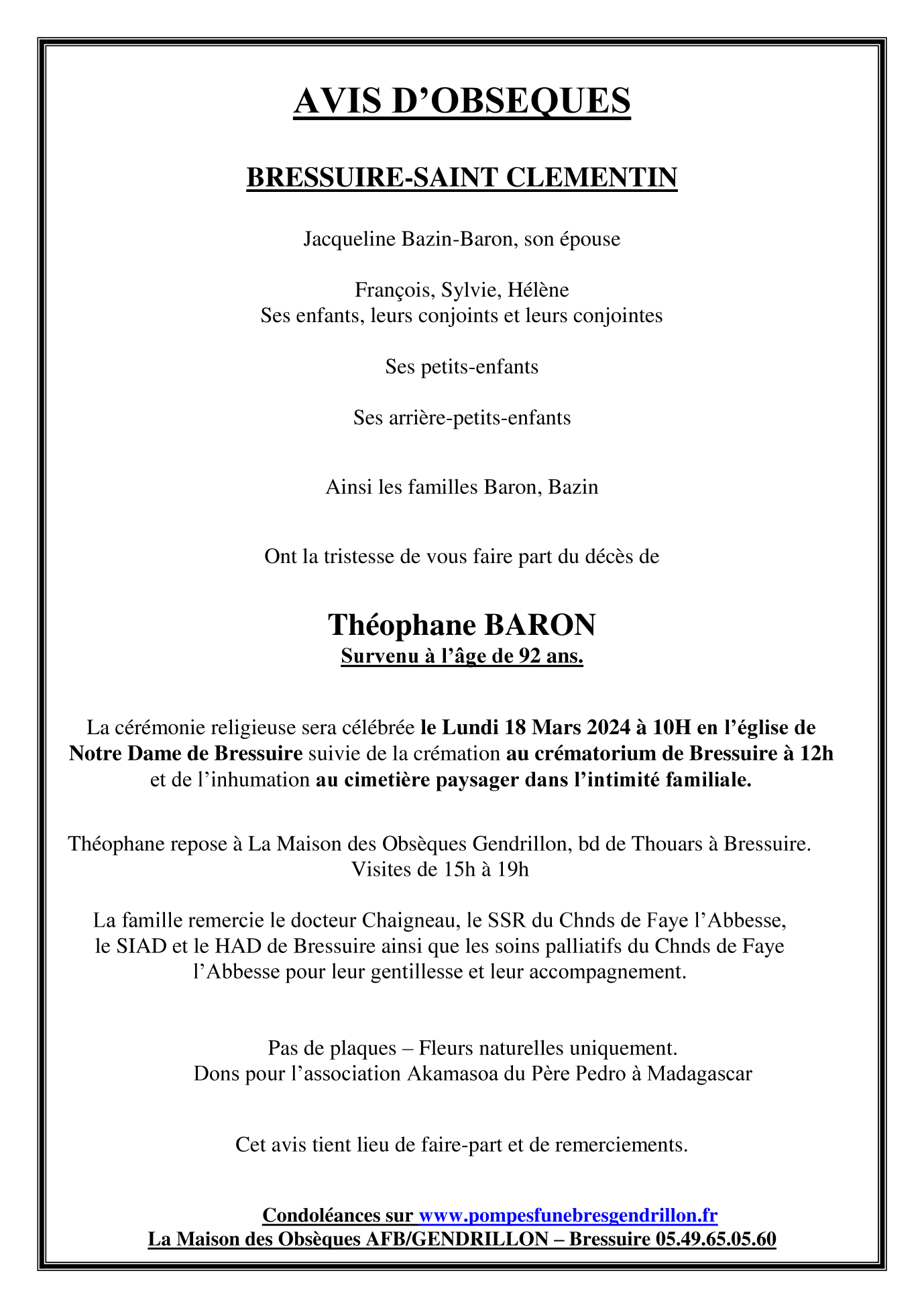Cet espace « condoléances » est dédié à la mémoire de Monsieur Théophane BARON.