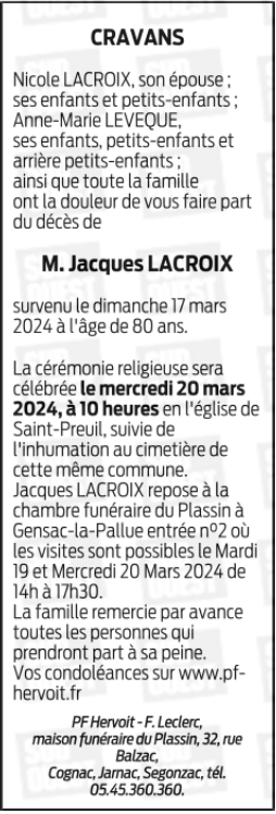 Cet espace « condoléances » est dédié à la mémoire de Monsieur Jacques LACROIX.