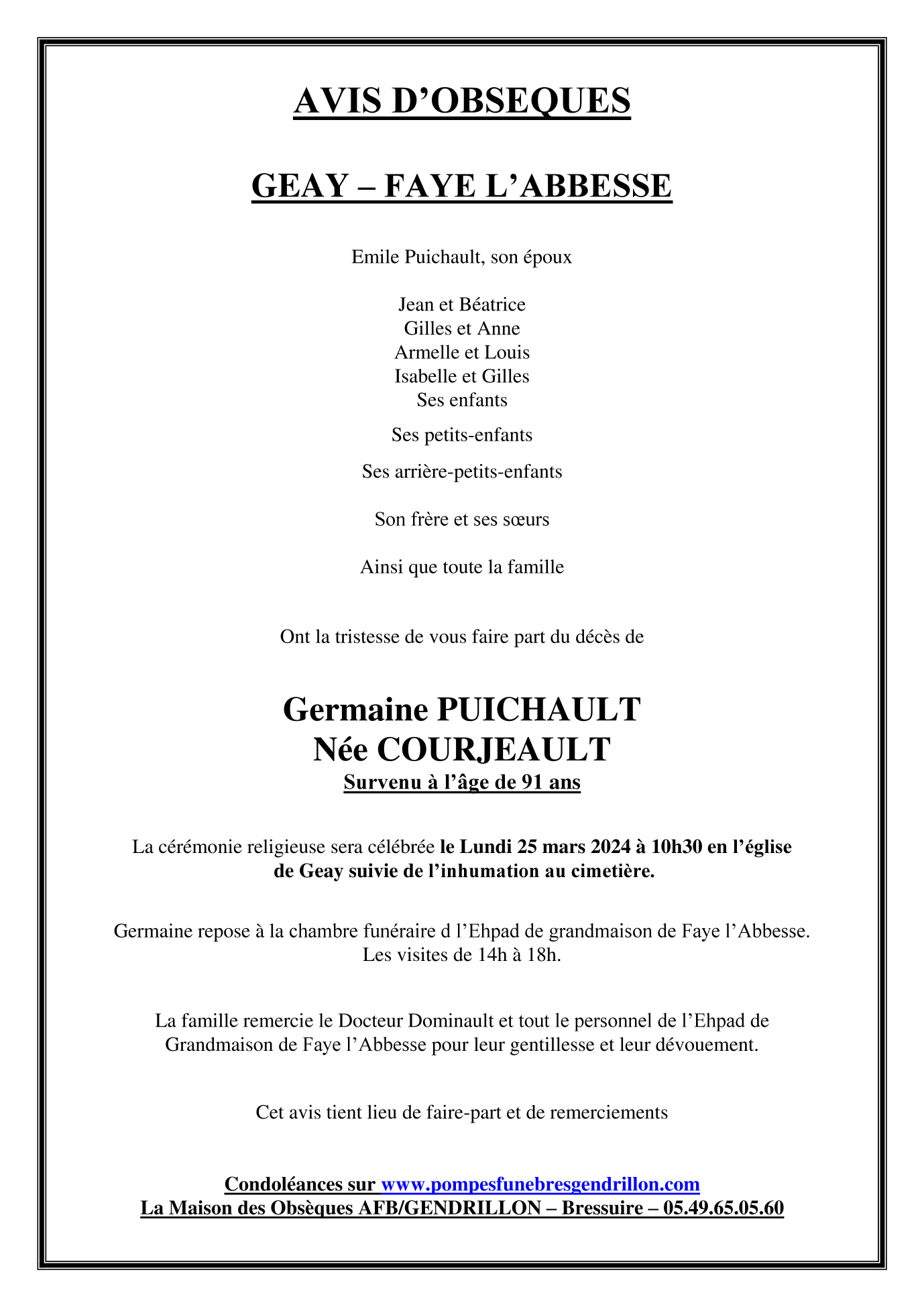 Cet espace « condoléances » est dédié à la mémoire de Madame Germaine PUICHAULT née COURJEAULT.