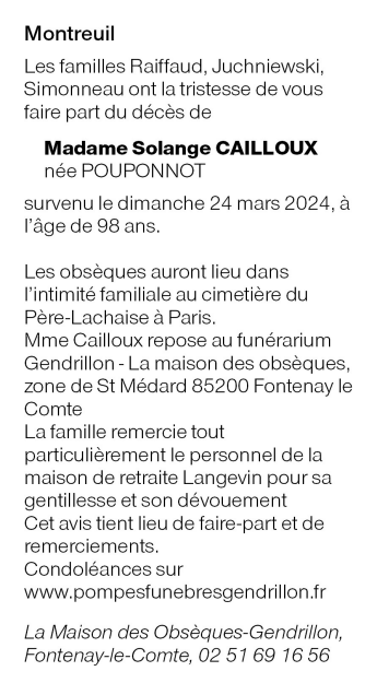 Cet espace « condoléances » est dédié à la mémoire de Madame Solange CAILLOUX née POUPONNOT.
