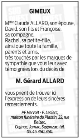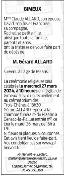 Cet espace « condoléances » est dédié à la mémoire de Monsieur Gérard ALLARD.