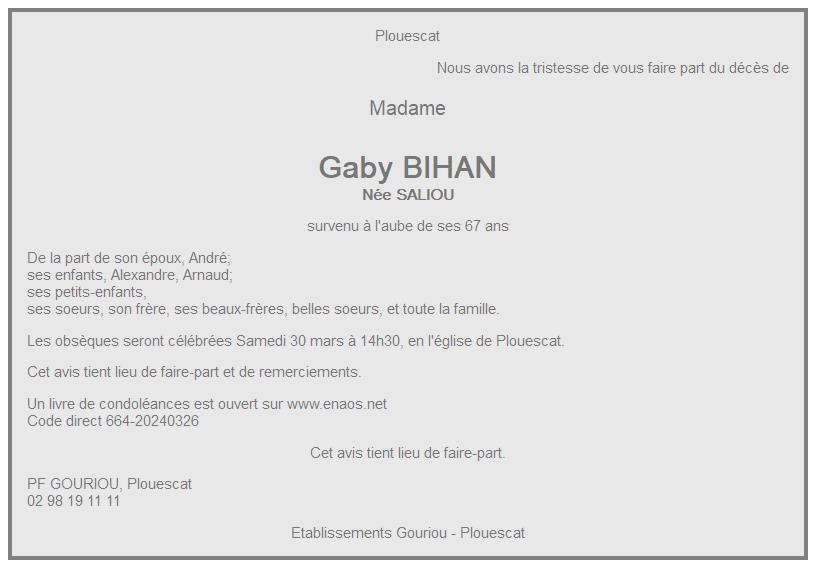 de Madame Gaby BIHAN née SALIOU