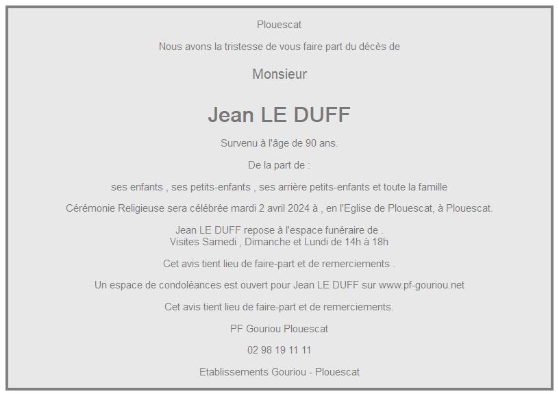 Cet espace « condoléances » est dédié à la mémoire de Monsieur Jean LE DUFF.