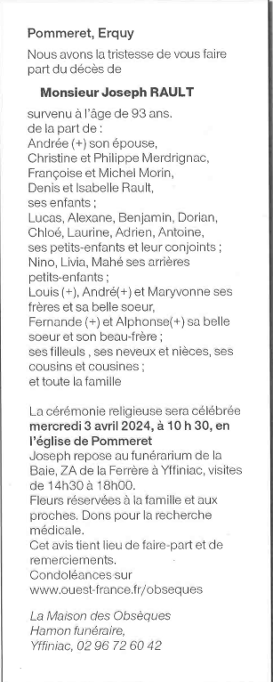 Cet espace « condoléances » est dédié à la mémoire de Monsieur Joseph RAULT.