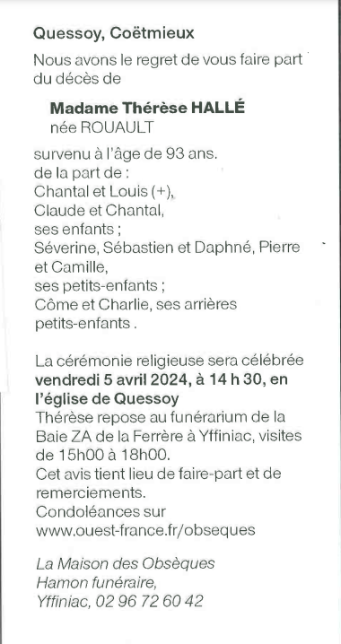 Cet espace « condoléances » est dédié à la mémoire de Madame Thérèse HALLÉ née ROUAULT.