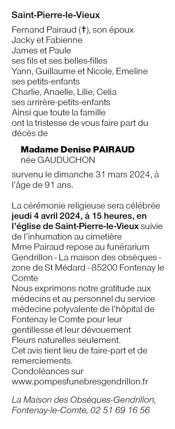 de Madame Denise PAIRAUD née GAUDUCHON