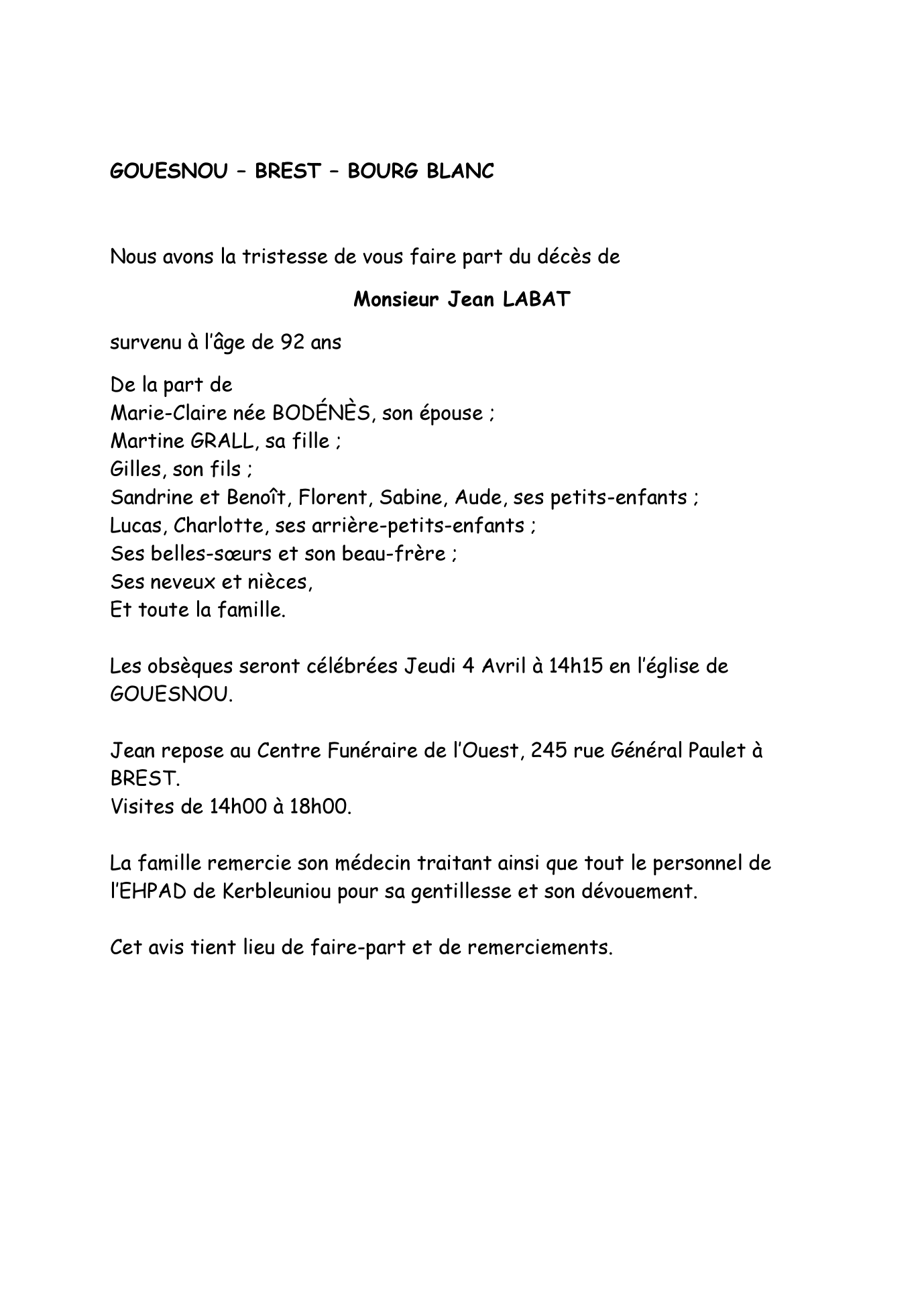 Décédé à Gouesnou (29850) le lundi 1 avril 2024
