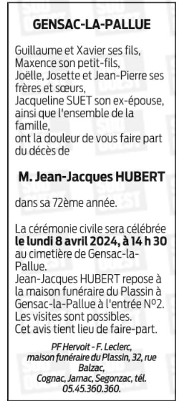 Décédé à Saint-Michel (16470) le lundi 1 avril 2024