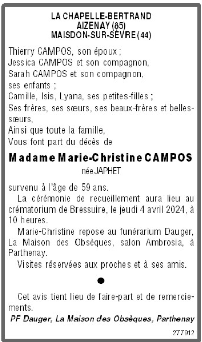 de Madame Marie Christine CAMPOS née JAPHET