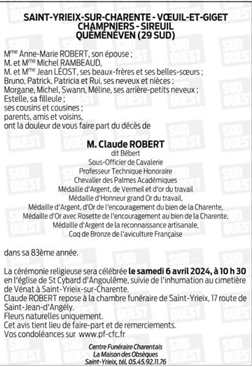 Cet espace « condoléances » est dédié à la mémoire de Monsieur Claude ROBERT.
