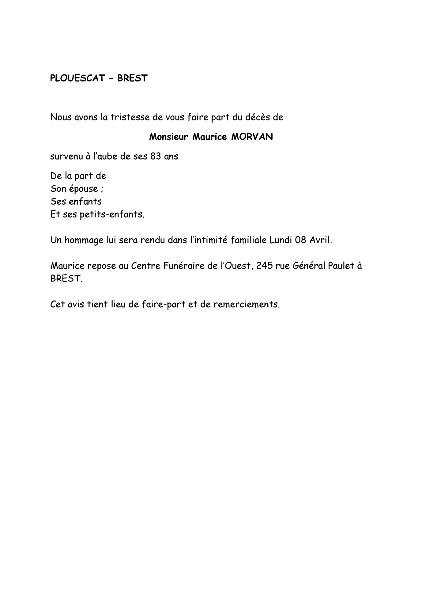 Décédé à Brest (29200) le jeudi 4 avril 2024