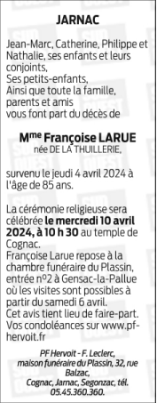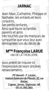 Cet espace « condoléances » est dédié à la mémoire de Madame Françoise LARUE née DE LA THUILLERIE.