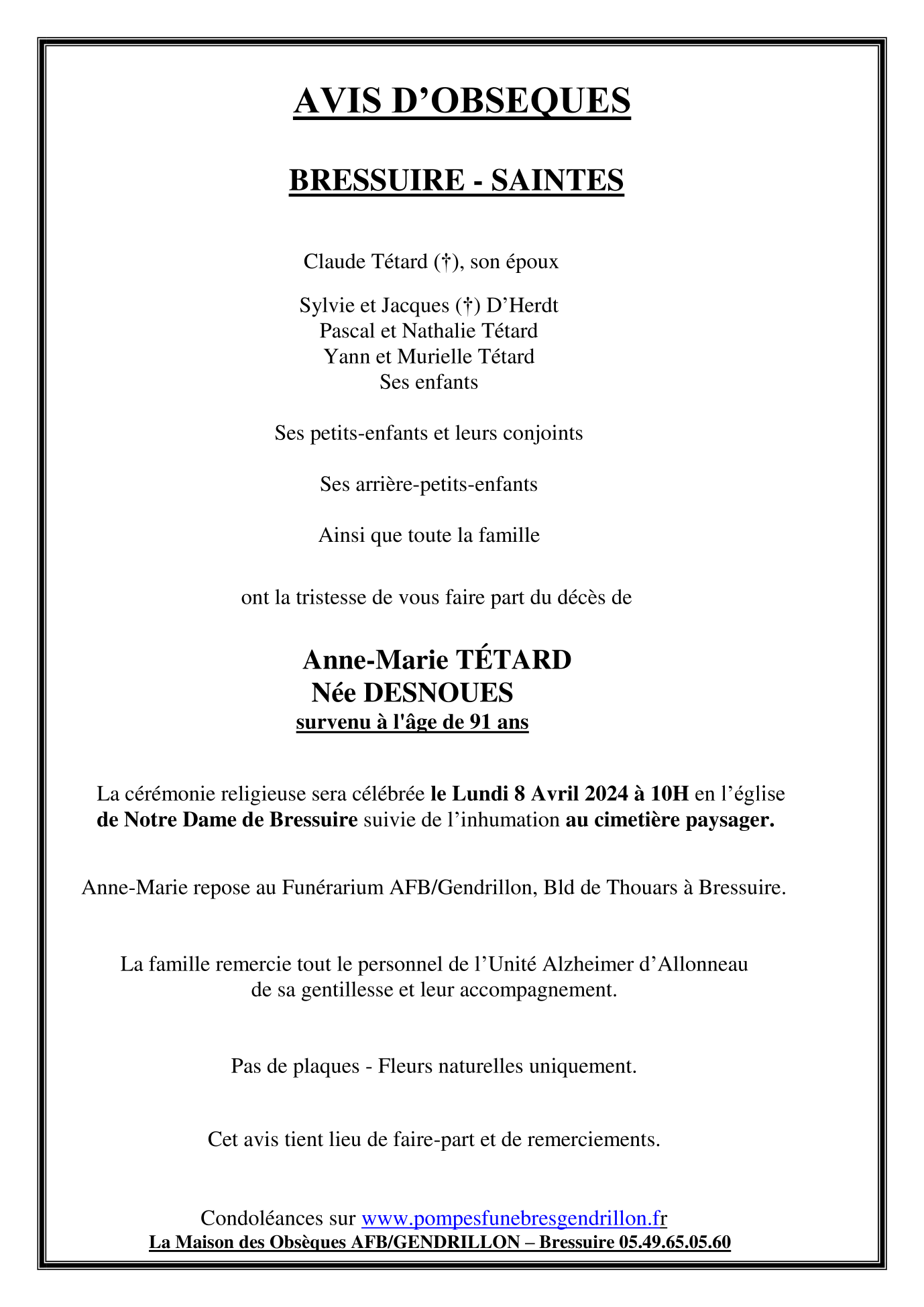 de Madame Anne-Marie TÉTARD née DESNOUES