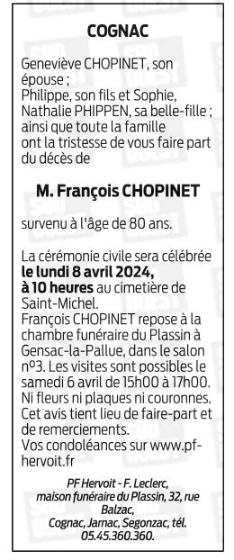 Cet espace « condoléances » est dédié à la mémoire de Monsieur François CHOPINET.