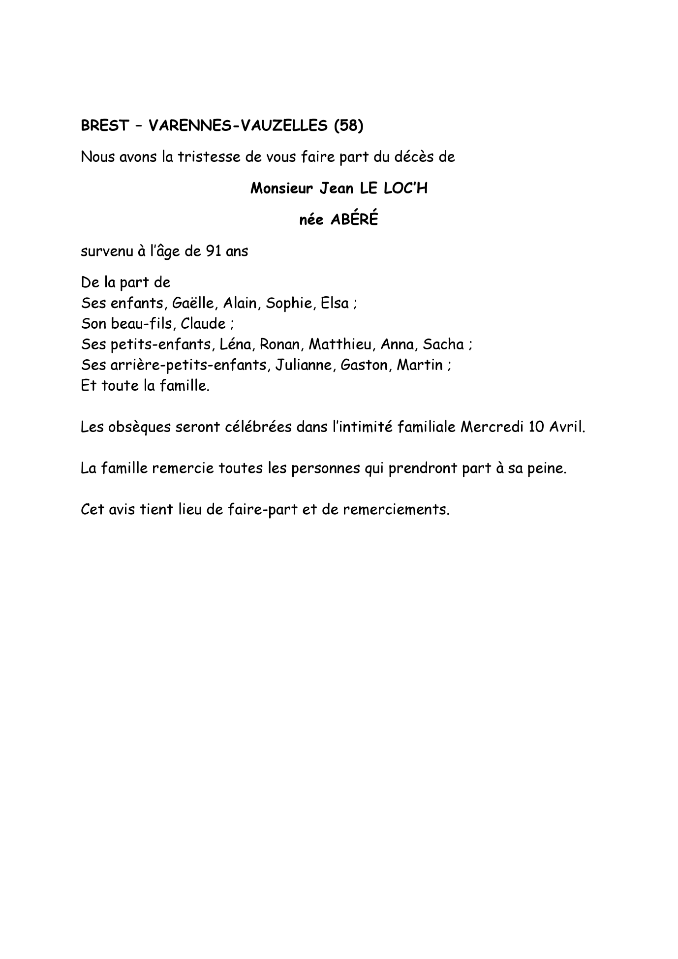 Cet espace « condoléances » est dédié à la mémoire de Monsieur Jean LE LOC'H.
