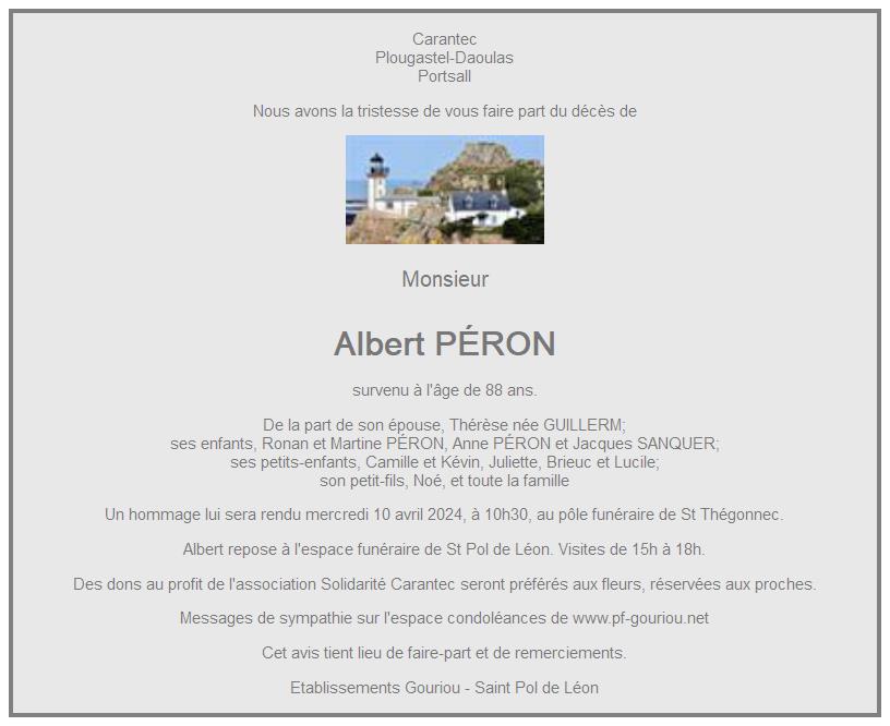 Cet espace « condoléances » est dédié à la mémoire de Monsieur Albert PÉRON.