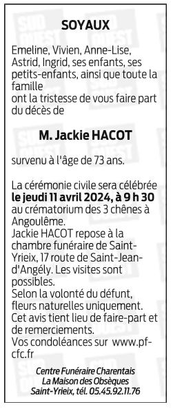 Cet espace « condoléances » est dédié à la mémoire de Monsieur JACKIE HACOT.
