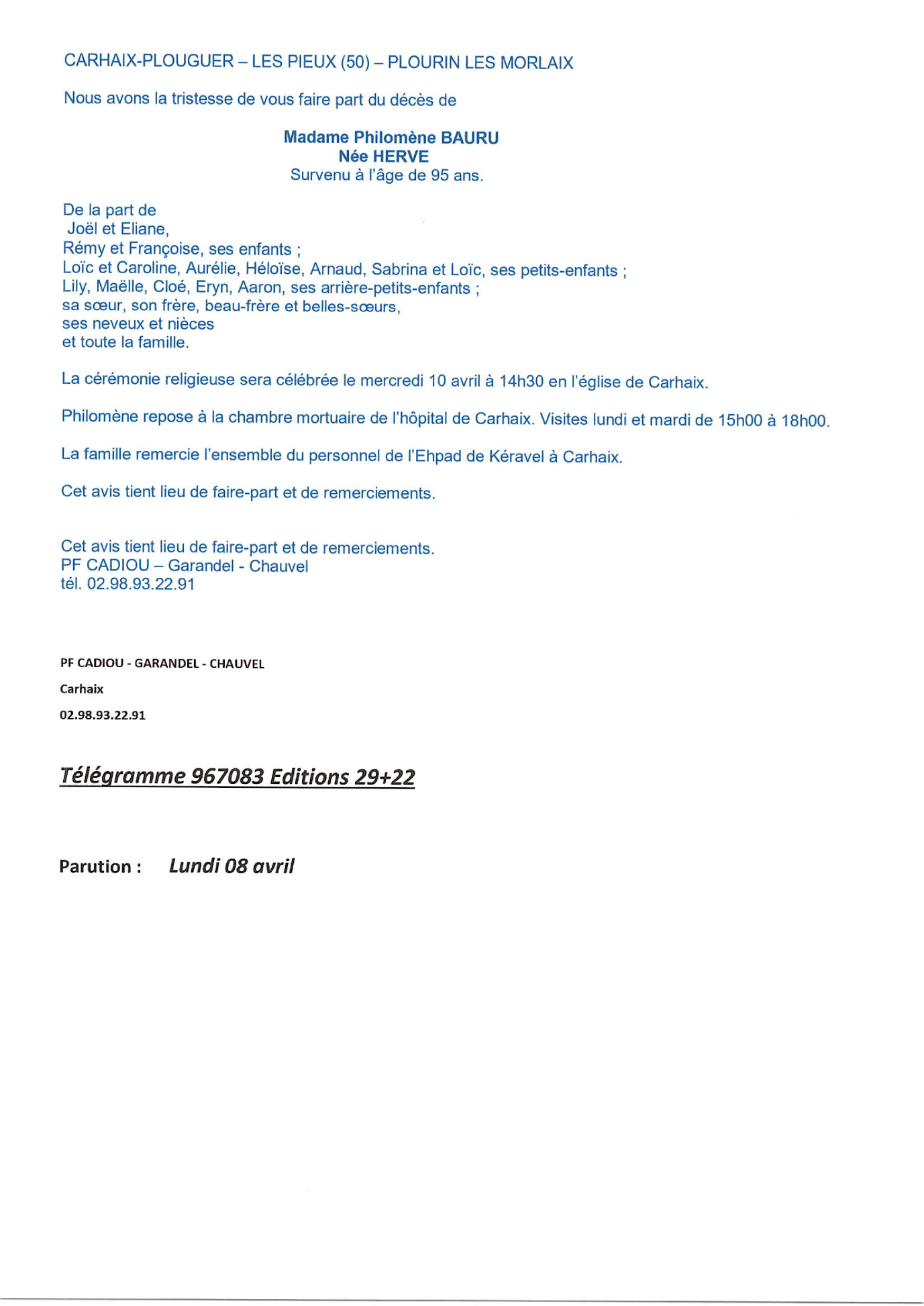 de Madame Philomène BAURU née HERVE