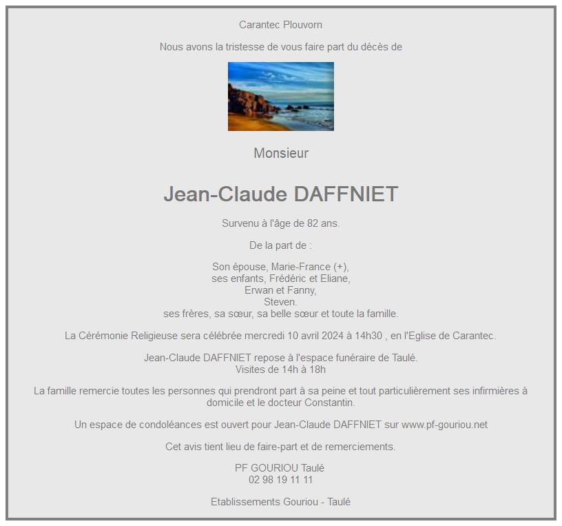 Cet espace « condoléances » est dédié à la mémoire de Monsieur Jean-Claude DAFFNIET.