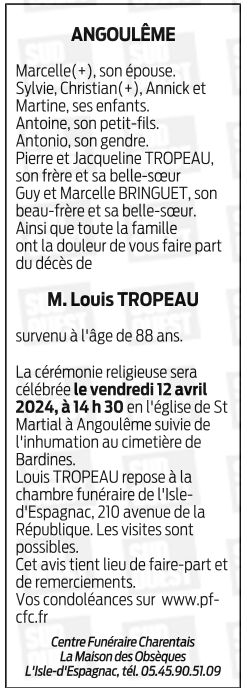 Cet espace « condoléances » est dédié à la mémoire de Monsieur Louis TROPEAU.