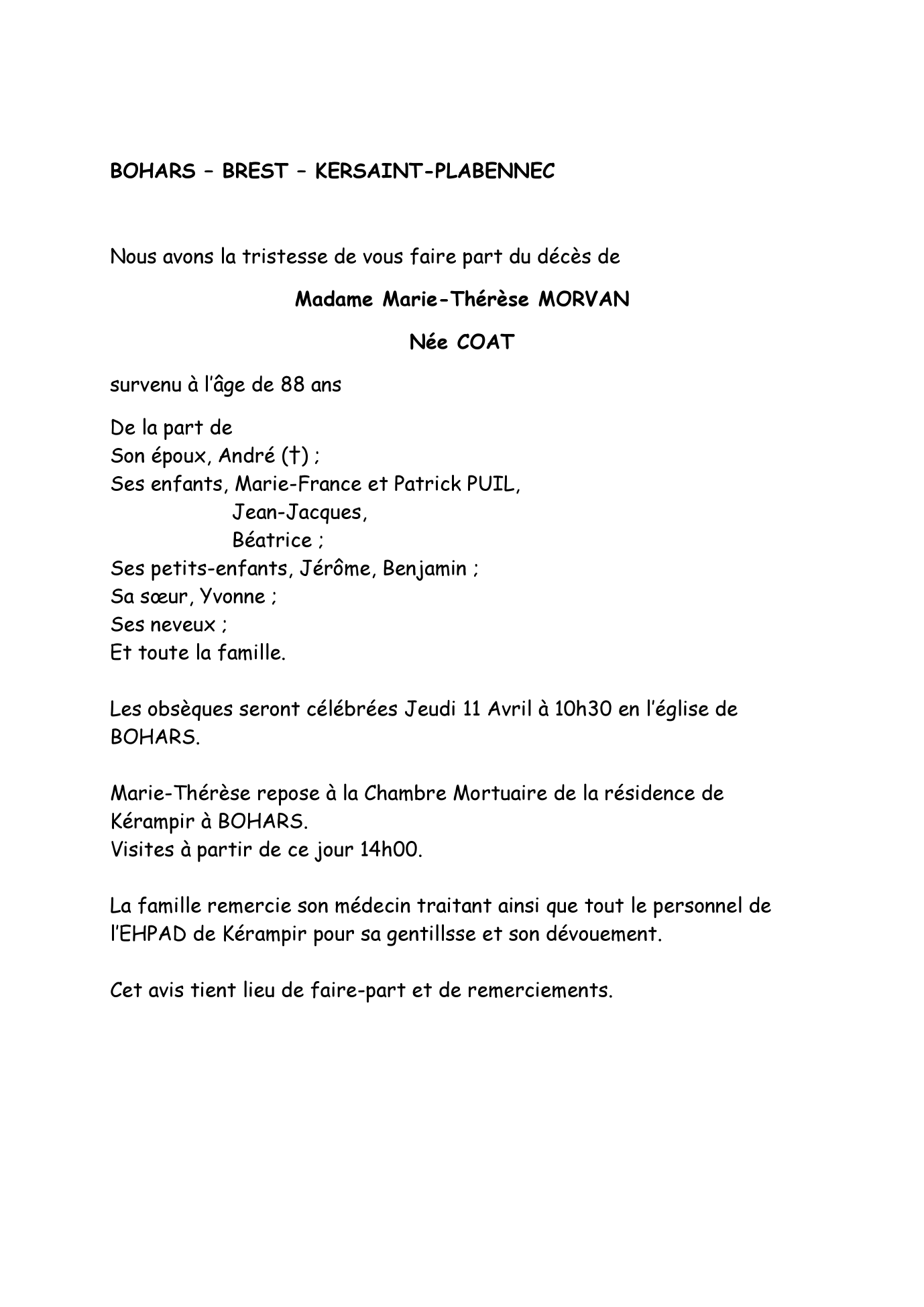 de Madame Marie-Thérèse MORVAN née COAT