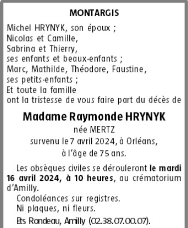 de Madame Raymonde HRYNYK née MERTZ