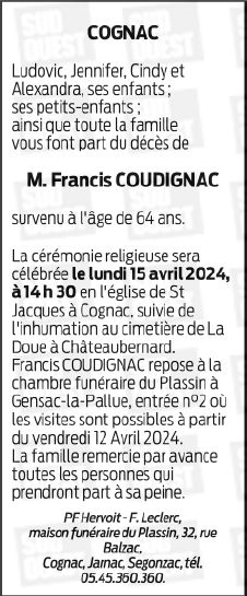 Décédé à Cognac (16100) le mardi 9 avril 2024