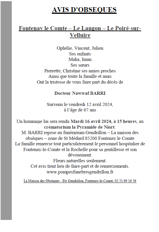 Décédé à Fontenay-le-Comte (85200) le vendredi 12 avril 2024