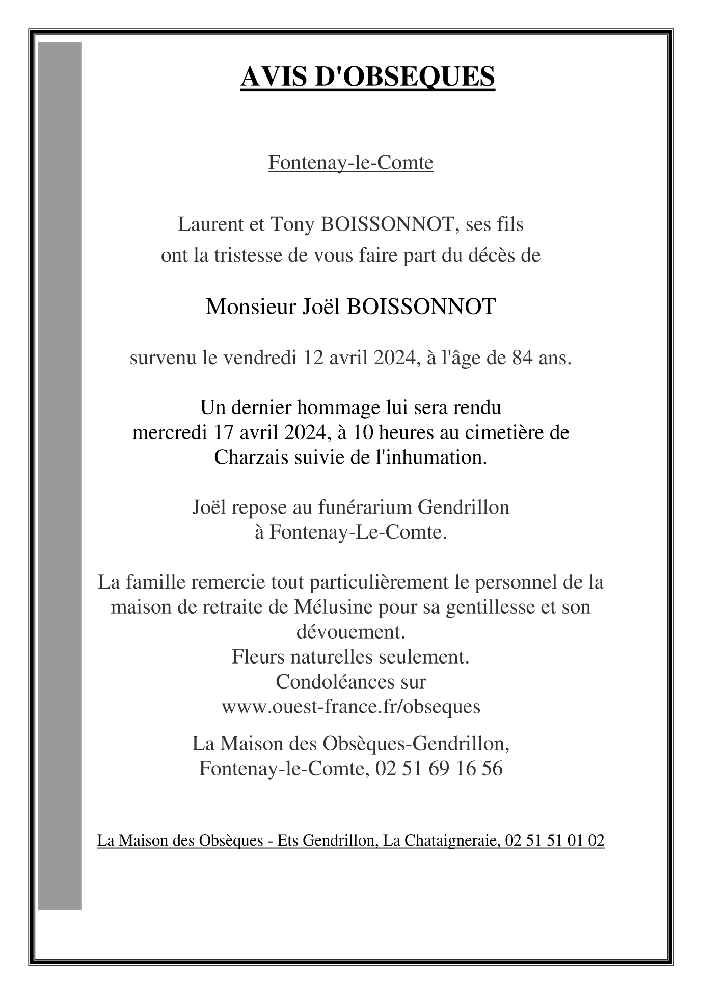 Décédé à Fontenay-le-Comte (85200) le vendredi 12 avril 2024