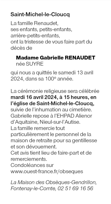 Cet espace « condoléances » est dédié à la mémoire de Madame Gabrielle RENAUDET née SUYRE.