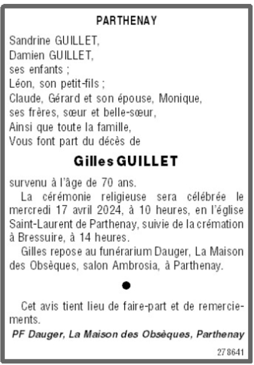 Cet espace « condoléances » est dédié à la mémoire de Monsieur Gilles GUILLET.
