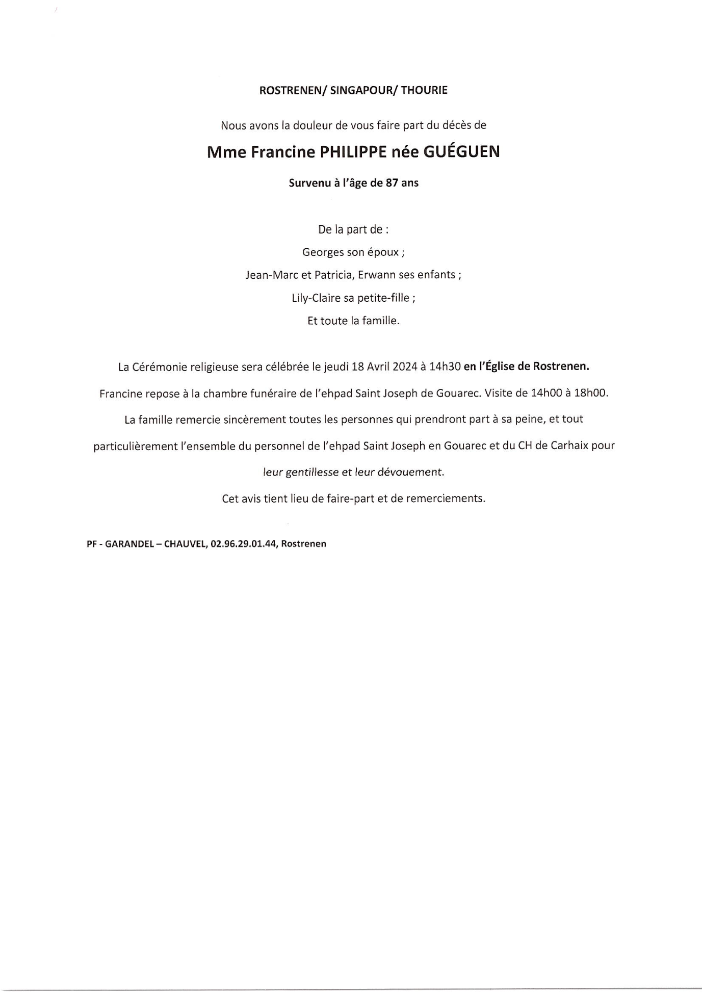 Cet espace « condoléances » est dédié à la mémoire de Madame Francine PHILIPPE née GUEGUEN.
