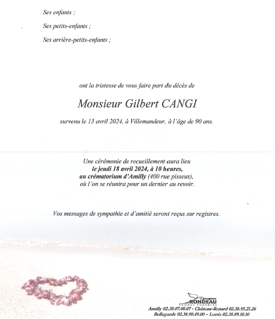 Cet espace « condoléances » est dédié à la mémoire de Monsieur Gilbert CANGI.