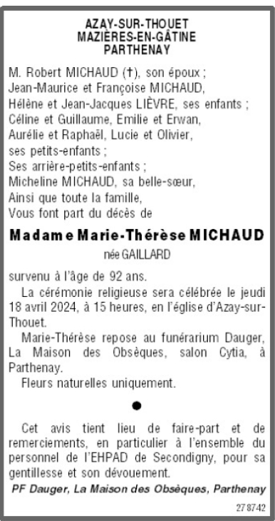 de Madame Marie-Thérèse MICHAUD née GAILLARD