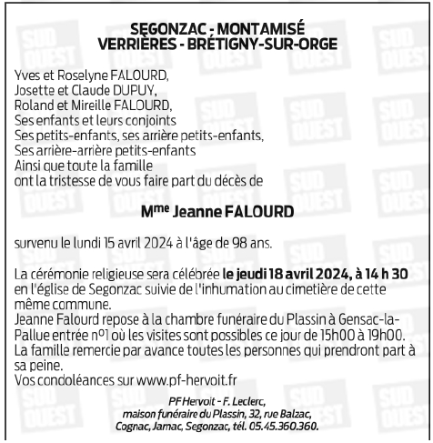 Cet espace « condoléances » est dédié à la mémoire de Madame Jeanne FALOURD née RENAUDEAU.