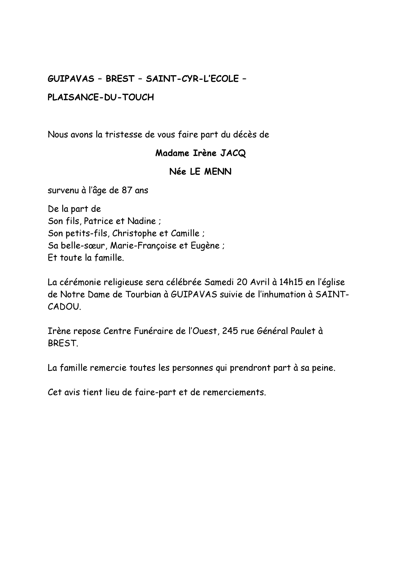 Cet espace « condoléances » est dédié à la mémoire de Madame Irène JACQ née LE MENN.