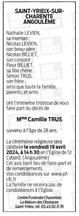 Cet espace « condoléances » est dédié à la mémoire de Madame Camille TRUS.