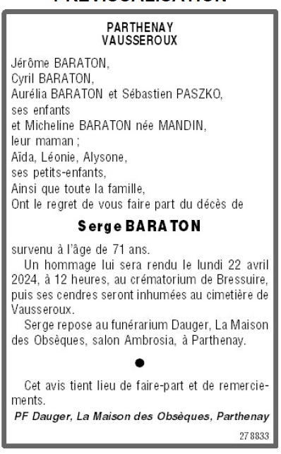 Cet espace « condoléances » est dédié à la mémoire de Monsieur Serge BARATON.
