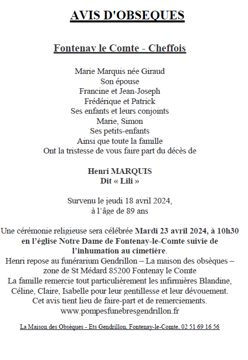 Décédé à Fontenay-le-Comte (85200) le jeudi 18 avril 2024