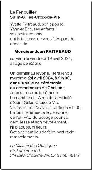 Cet espace « condoléances » est dédié à la mémoire de Monsieur Jean PAITREAUD.