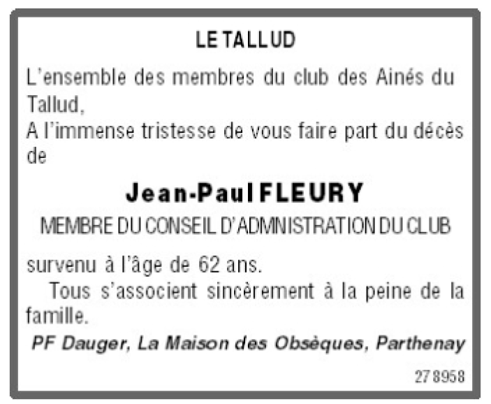 Cet espace « condoléances » est dédié à la mémoire de Monsieur Jean-Paul FLEURY.